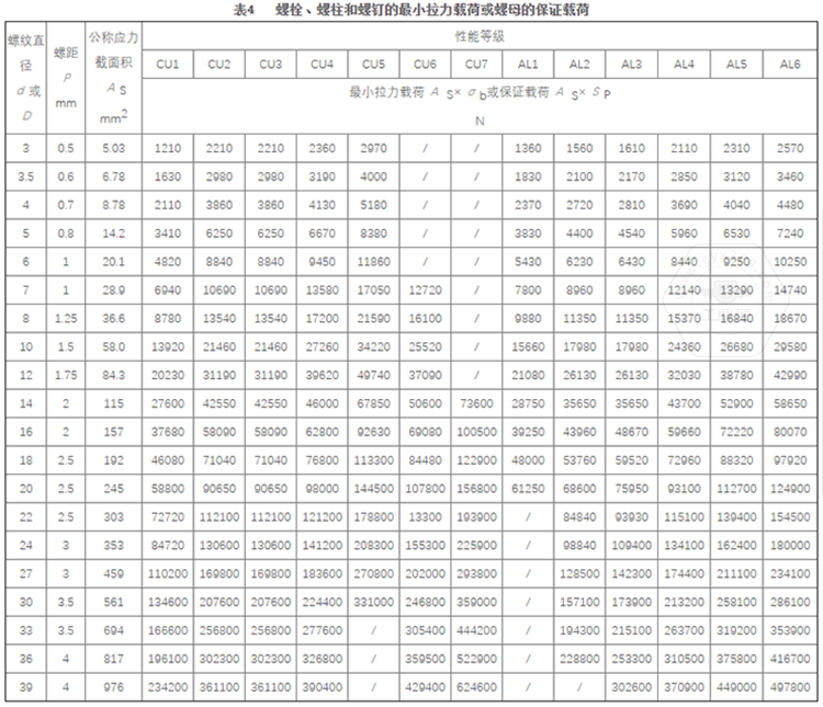 5.2 螺栓、螺柱和螺釘的蕞小拉力載荷按表4規(guī)定。
