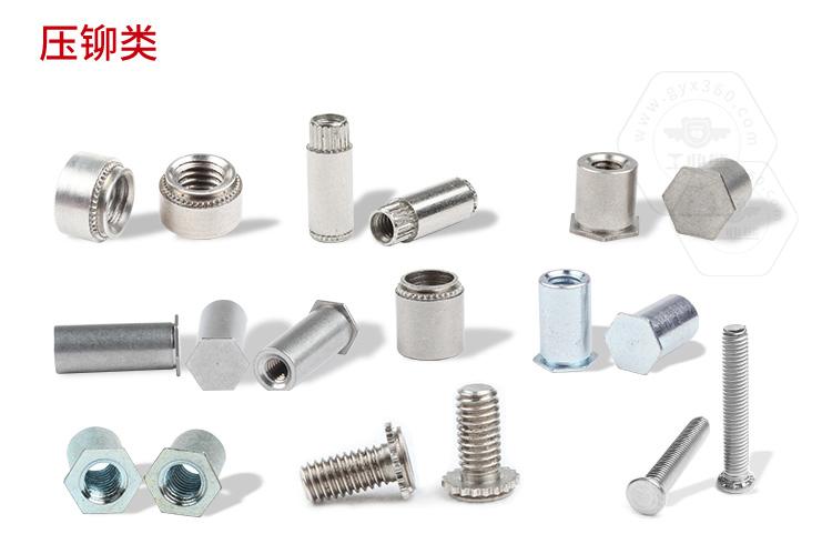 ●鉚螺母 壓鉚螺母又稱鉚螺母,自扣緊螺母,圓狀的外形,一端帶有花齒和導(dǎo)向槽,故又稱其為花齒螺母。為薄板提供高強度的螺紋鏈接,蕞小板厚可達0.03英寸-0.8毫米,螺紋尺寸#2到1/2英寸和M2-M10。